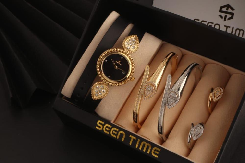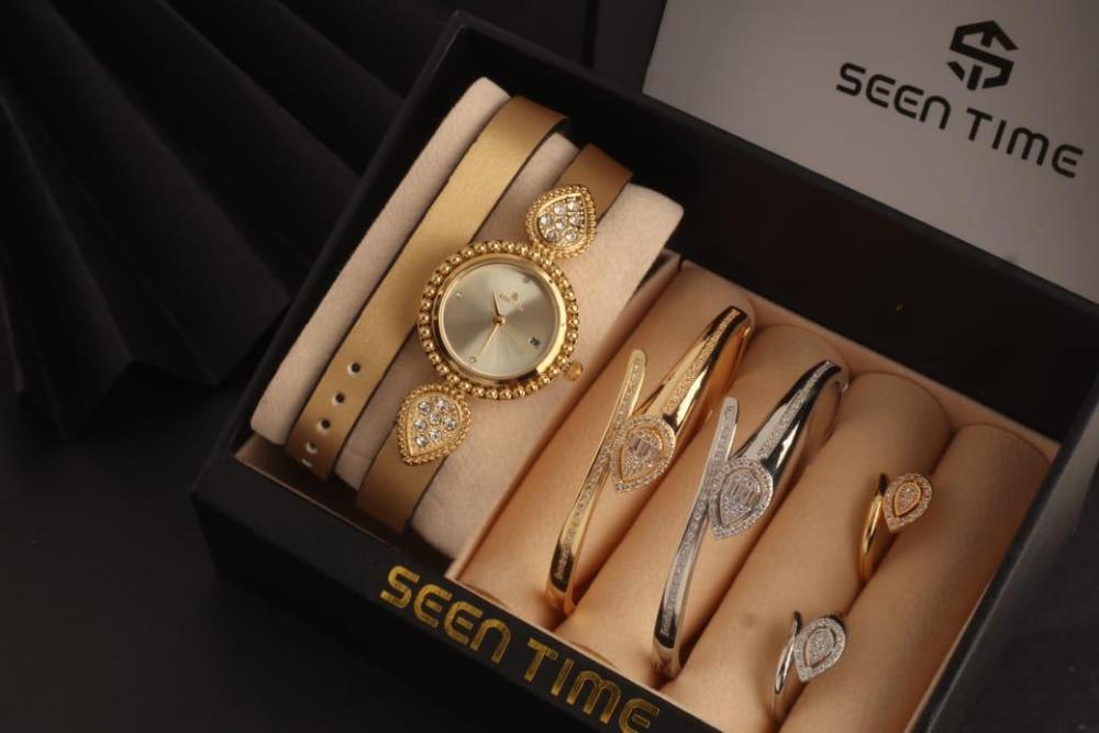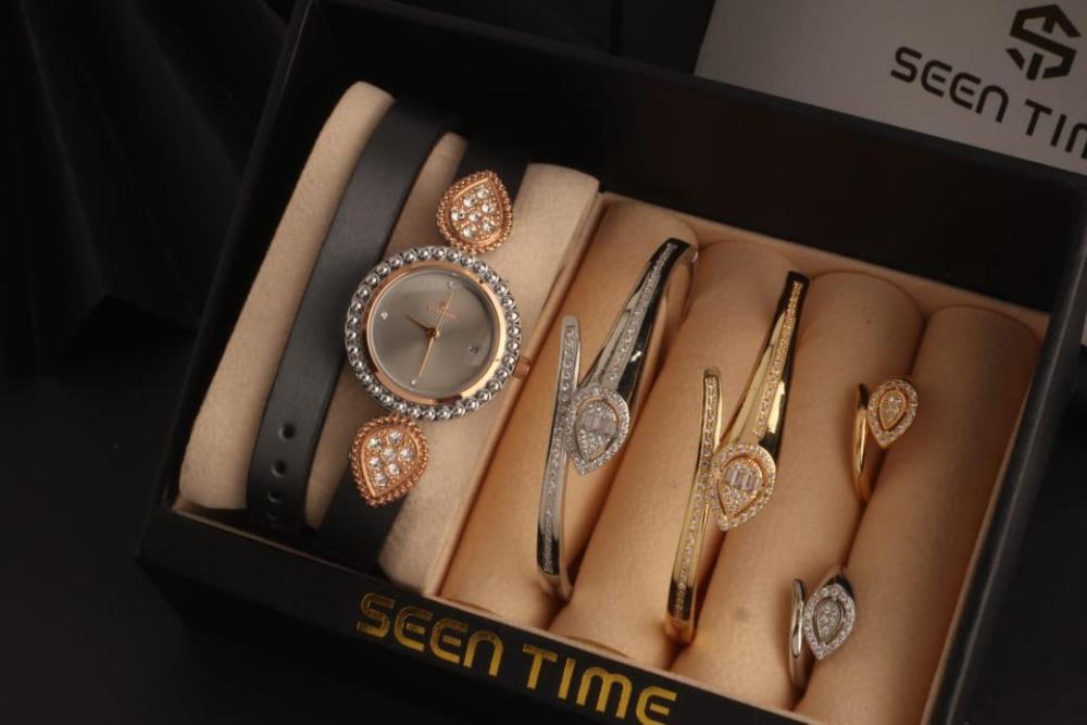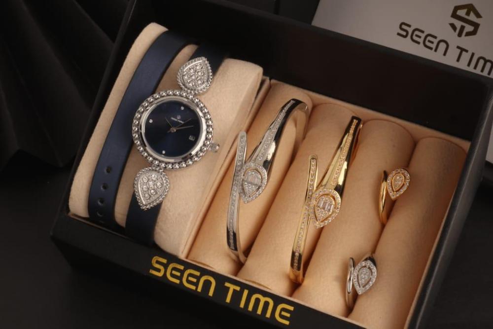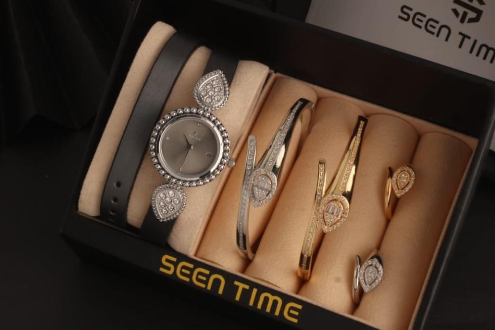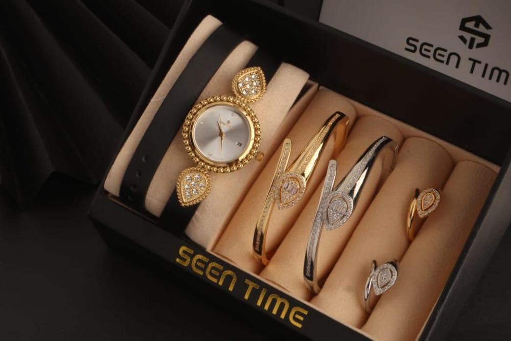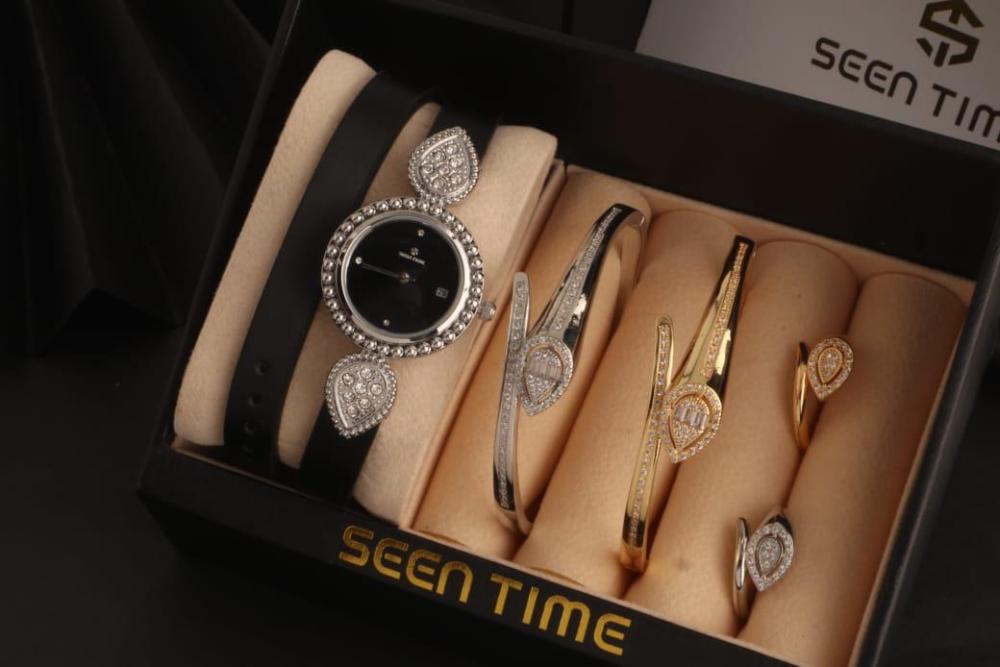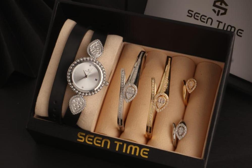 : ⭕ == *ساعه نسائية جلد ( لفتين ) استيل من ماركة ( SEEN TIME ) موديل ماركة بوشرون الجديد فصوص* . 🔴 *مكينة ياباني ضمان مويا ولون سنتين* .. 🔴 *مقاس الساعة 29 mm* . ⭕ *2 أساور مع 2 خواتم ماركة بوشرون الجديدة* ... 🔴 الاساور مقاس 18 mm . 🔴 الخواتم مقاس 7 _ 8 فقط . الساعه يجي معاه ملحقاتة : = علبة الماركة نفس الصوره . = كيس الماركة ورق فخم نفس الصورة . = كرت ضمان الساعه سنتين . ⭕⭕ == *قيمة الطقم كامل ب 255﷼