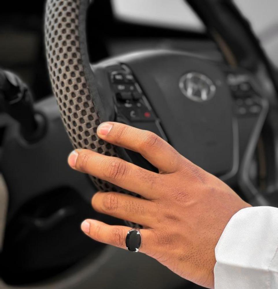 خاتم ملكي بتصميم راقي وأنيق، مصنوع من الفضة عيار 925 المقاومة للصدأ والتي لاتتأثر بالحرارة ولا الماء، يضم في وسطه قطعة من الحجر باللون الأسود المعرق مع كتابة الاسم حسب الطلب.