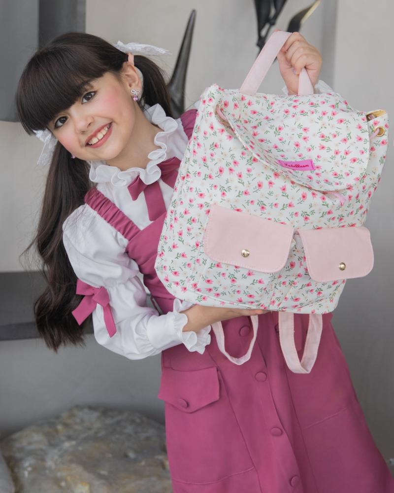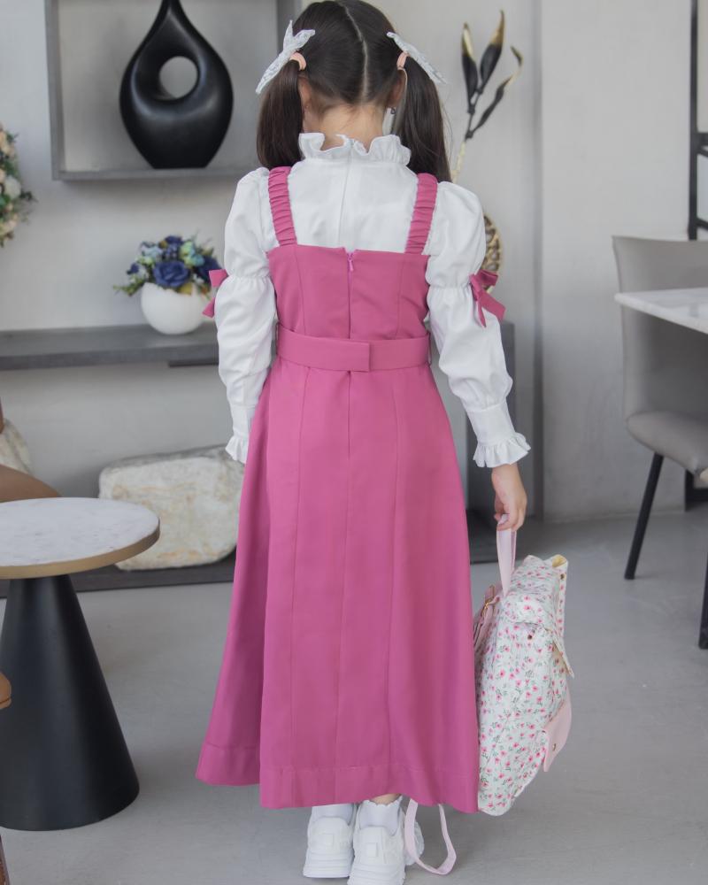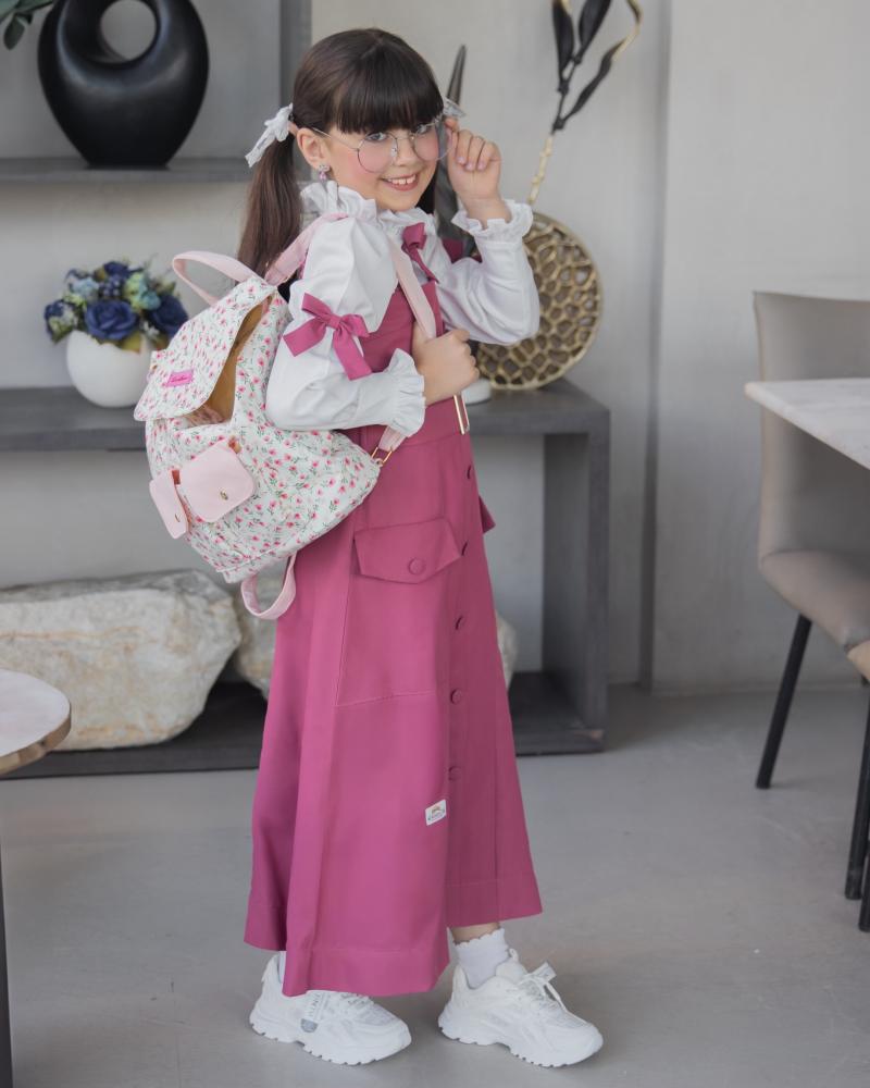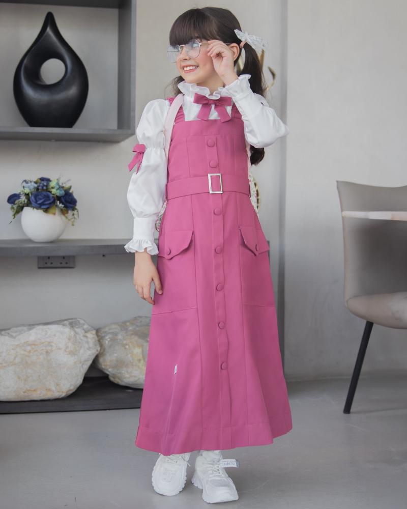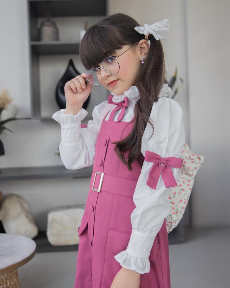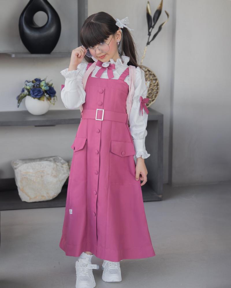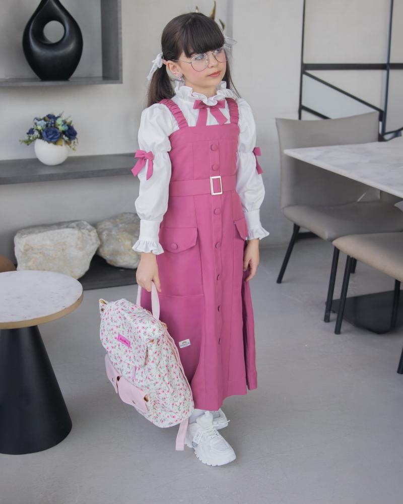 صمم بقطعتين شيال بلون وردي بتصميم فتحة رقبة ناعمة ومزينه بفيونكة من الامام مع قميص منفصل بلون ابيض